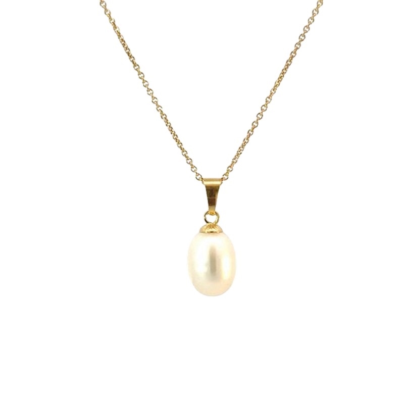 Denne halskæde kombinerer et enkelt perlevedhæng med en let forgyldt kæde. Udtrykket er roligt og klassisk og kan ofte bruges både til hverdag og ved mere formelle lejligheder.