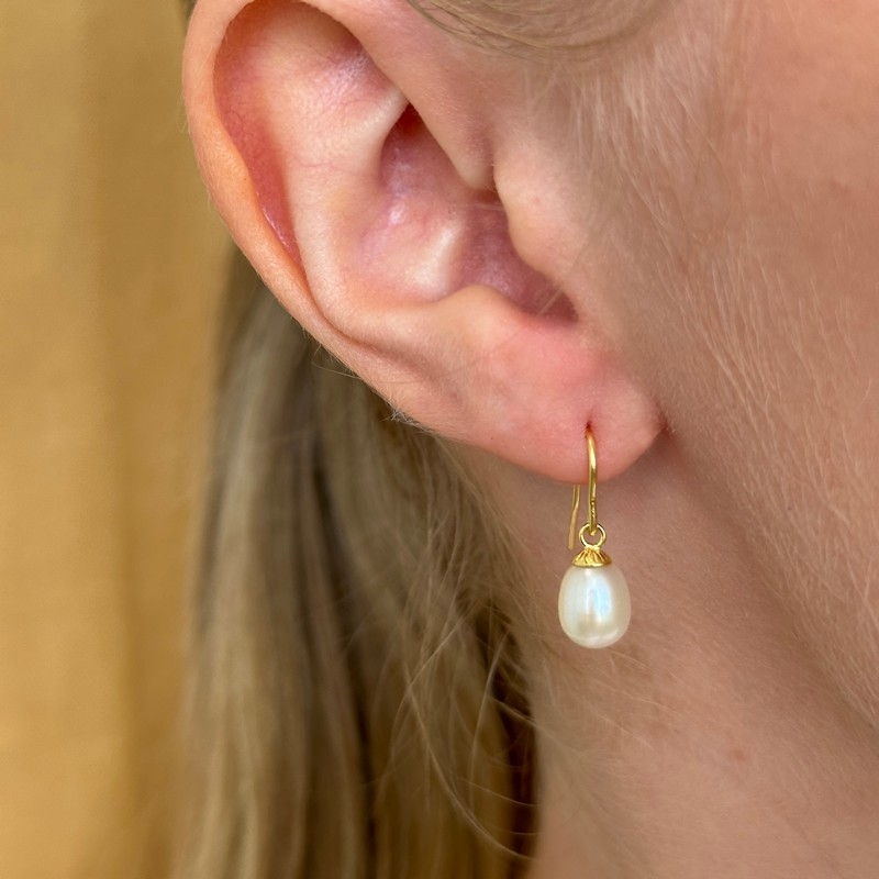 Smukke 8kt guld perleørehængere. Ørehængerne består af en smuk oval hvid ferskvandsperle og en fin enkelt ørebøjle, som giver et smukt feminint udtryk. Perler er et natur materiale så ikke to perler er ens. Det betyder at der altid vil være små forskelle fra den perle du ser på billedet og den perle du modtager. Perler er unikke og det er det der gør dem så eksklusive i brugen af smykker.