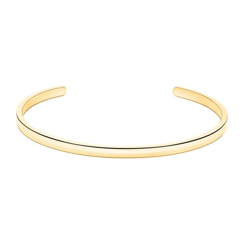 Denne armring er udført i forgyldt stål og har et klassisk, åbent udtryk. Formen er enkel og tidløs, hvilket gør den let at kombinere med både hverdags- og mere formelle outfits.