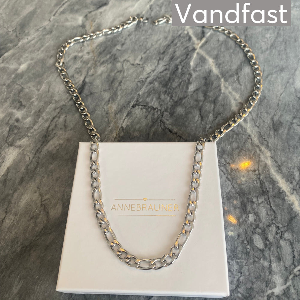 ANNEBRAUNER Figaro Halskæden kendetegnes ved sit særlige mønster, hvor der skiftevis er korte og lange led. Dette design giver halskæden et unikt og elegant udseende, der skiller sig ud fra mere traditionelle kæder.
