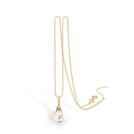 Oplev en fin kombination af elegance og naturlig skønhed med vores 9kt vedhæng fra Blossom Copenhagen, prydet med en fortryllende rutilkvarts, der glitrer med stjernestøv. Dette smukke vedhæng kommer komplet med en sølvforgyldt kæde på 45 cm, der fuldende