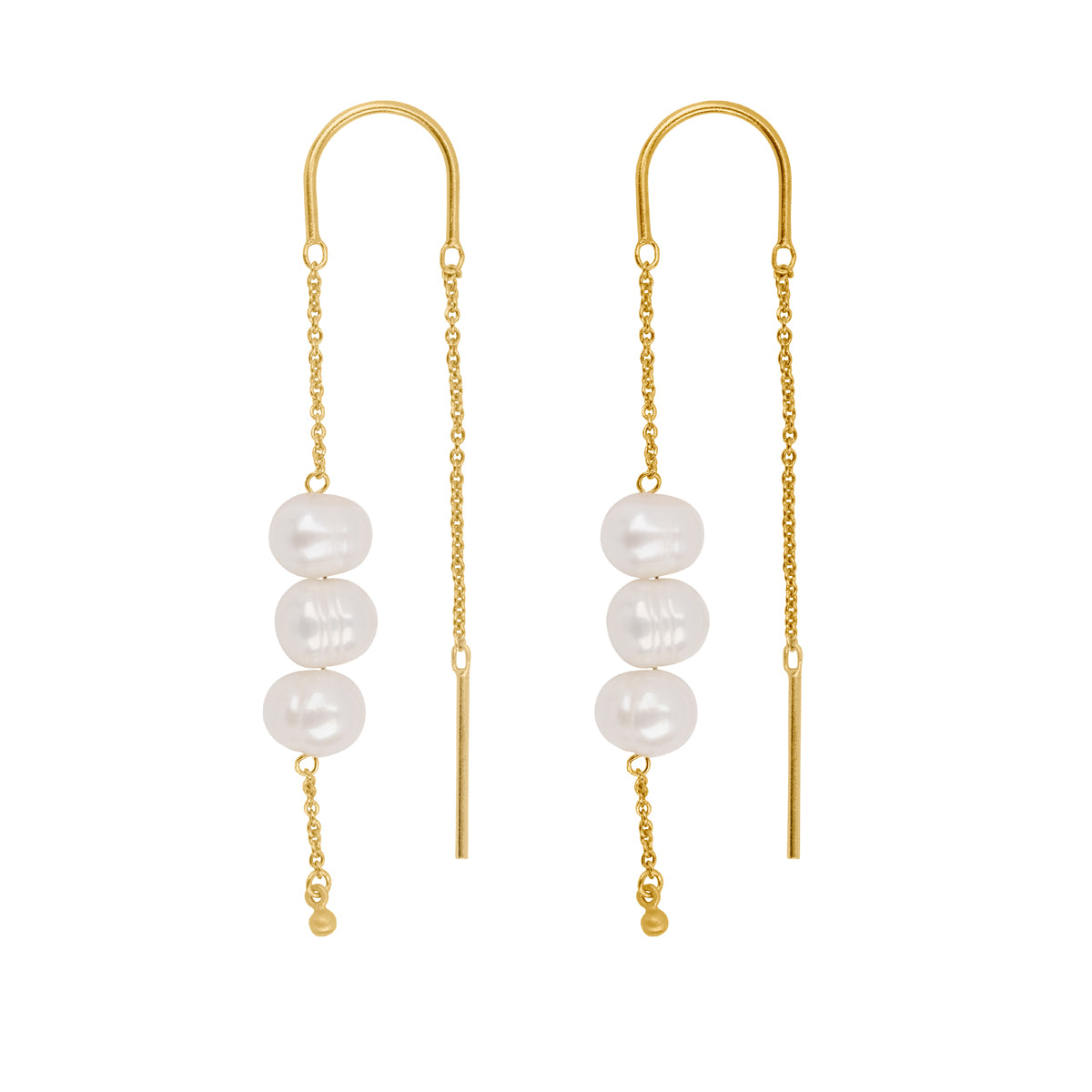 Sølv forgyldte ørehænger med kæde og fast bøjle. På kæden hænger der 3 perler tæt sammen.