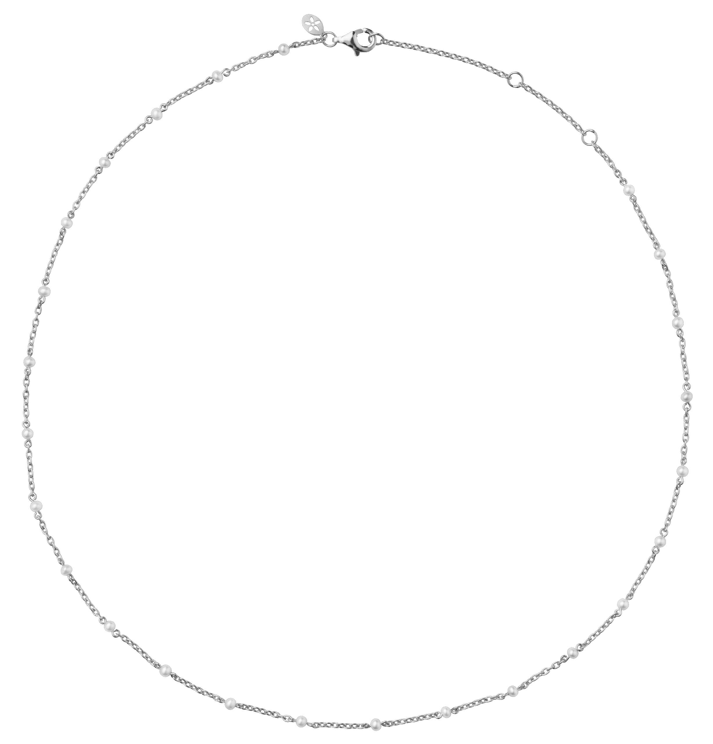 Sølv collier med perler fra byBiehl. Kæden er i serien Scarlett, som er en fin serie med perler. Kæden har 25 hvide freskvandsperler. Længden er 45cm og kan kortes til 42 og 40cm.