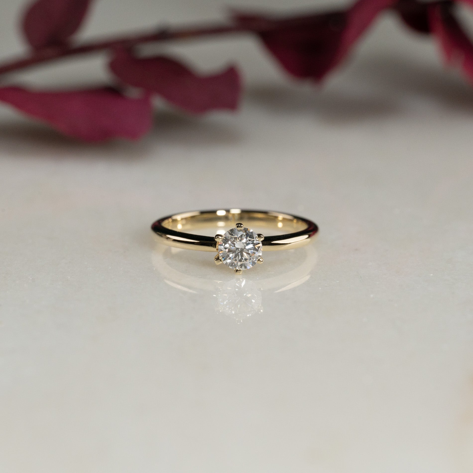 Diamantring i 14 karat guld med en 0,5 ct. lab-grown brillantslebet diamant. Diamanten er fattet i en lav, klassisk fatning med seks grabber. Ringen er et klassisk og elegant smykke, som er velegnet til enhver lejlighed. Ringen er ligeledes velegnet som forlovelsesring. Ringen er udført i 14 karat massiv guld med én lab-grown diamant, der har en vægt på 0,5 ct. Diamanten har farven E/F (River) og klarheden VVS. Smykket er skabt med omtanke; diamanterne er fremstillet med blandt andet solenergi, og guldet er 100% certificeret genanvendt. Ringen kommer i vores eksklusive Diamond Collection boks med en flot smykkeæske, certifikat og pouch. Boksen er også perfekt, hvis smykket skal gives som gave.