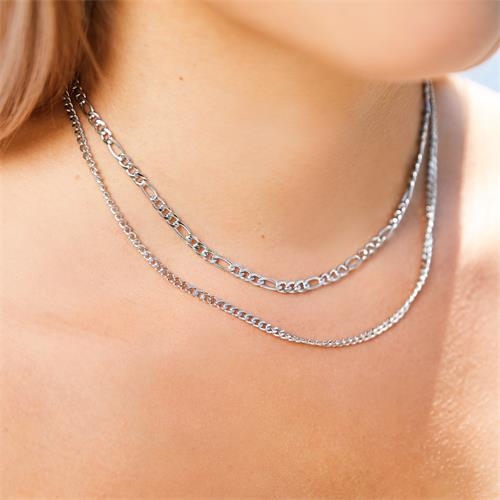 Dobbelt Collier i Stål.Fin dobbelt halskæde i Stål. Her sølvfarvet look.Halskæden består af en Panserkæde og en Figarokæde.Halskædens længde er variabel og kan benyttes i længder fra 42 til 47 cm.