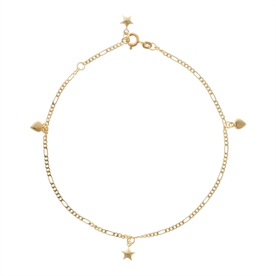 Elegant Figaro ankelkæde i 14 kt. Guld med 2 stjerner og 2 hjerter.Kædens kan benyttes i længderne 23 og 25 cmBY LUND COPENHAGEN5620125