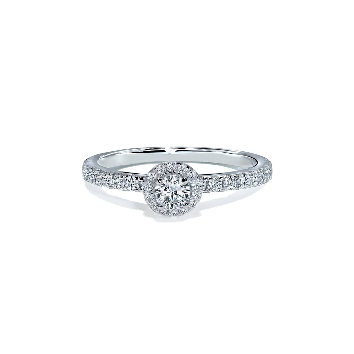 Klassisk rund halo forlovelsesring i hvidguld med diamantbånd