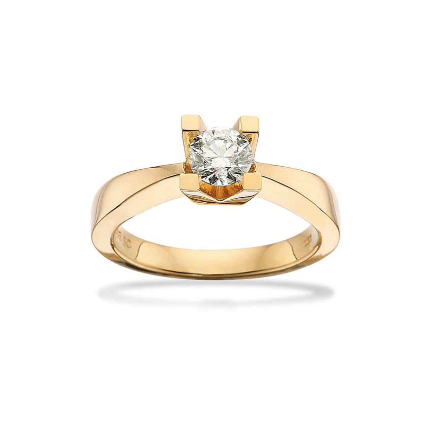 Kleopatra ring i 14 karat guld med en enkelt smuk brillant sleben diamant. Mere klassiske bliver det næsten ikke når vi taler diamantringe. Den enkle ring med en solitære diamant et utrolig populær fordi den er smuk, tidløs, og behagelig at have på fingeren.Lad dine smykke drømme starte med et smykke fra Kleopatra. Start med en mindre diamant og lad den vokse sig større og større. Indtil2 år efter du har købt et Kleopatra smykke, kan det ombyttes til et nyt smykke med en større diamant. Du betaler kun prisforskellen mellem dit gamle smykke og det ny smykke.KLEOPATRA er dansk design og godt guldsmedehåndværk isat brillantslebne diamanter. En brillant er en diamant, der er slebet rund med 58 facetter. Det er slibningen der giver lyset den smukkeste brydning, og får dit smykke til at funkle.Diamant kvaliteten i KLEOPATRA er Wesselton SI. Wesselton betyder at farven er smuk og hvid, og SI er betegnelsen på klarheden i diamanten.I tvivl om din ringstørrelse. Kig under STØRRELSESGUIDEOBS: Det viste billede svare ikke overens med den rigtig diamant størrelse.Alle Kleopatra smykker leveres med ægte diamantcertifikat og i en lækker smykkeæske.
