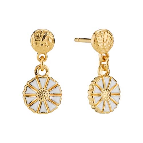 Marguerit Ørestikker i forgyldt Sølv med rustikke Plader.Marguerit Ørestikker i forgyldt Sølv med små rustikke Plader og 2 hvide Margueritter.Margueritternes diameter er 7 mm​.Margueritøreringenes overflade er poleret og emaljeret.BY LUND COPENHAGENAlle