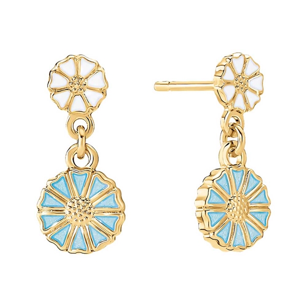 Marguerit ørestikker i 24 kt. forgyldt Sølv med en kombination af hvide og lyseblå margueritter. Margueritternes diameter er 7,5 og 5 mm. Overfladen er poleret og håndmalet med ægte emalje.BY LUND COPENHAGEN9095097-6-LB