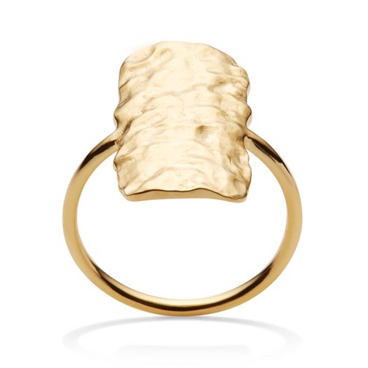 Den lækre og enkle Cuesta ring fra Maanesten i forgyldt sterlingsølv. Cuesta ringen er prydet med en enkelt gylden plade med en struktureret overflade. En smuk ring du kan bruge alene som statement ring til dagens outfit.Maanesten er designet af Lotte Venø Callesen. Lotte designer smykker der rammerlige ind i tidens ånd med et design der er inspireret af blomster, havet og naturens strukturer og mønstre. Kollektionerne består af ringe, halskæder, armbånd og ikke mindst øreringe i både sølv og forgyldt med sten og perler i alverdens farver.