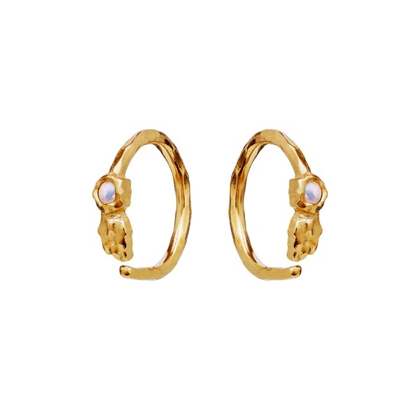 Florus creolerne i forgyldt fra Maanesten med den fineste lille syntetiske hvide opal. Creolerne skal vrides en smule for at komme iøret.Prisen er for et par.Maanesten er designet af Lotte Venø Callesen. Lotte designer smykker der rammer lige ind i tidens ånd med et design der er inspireret af blomster, havet og naturens strukturer og mønstre. Kollektionerne består af ringe, halskæder, armbånd og ikke mindst øreringei både sølv og forgyldt med sten og perler i alverdens farver.Vridlås – det er vigtigt at man åbner og lukker creolen, ved at vride ringen til siden, ikke op og ned.