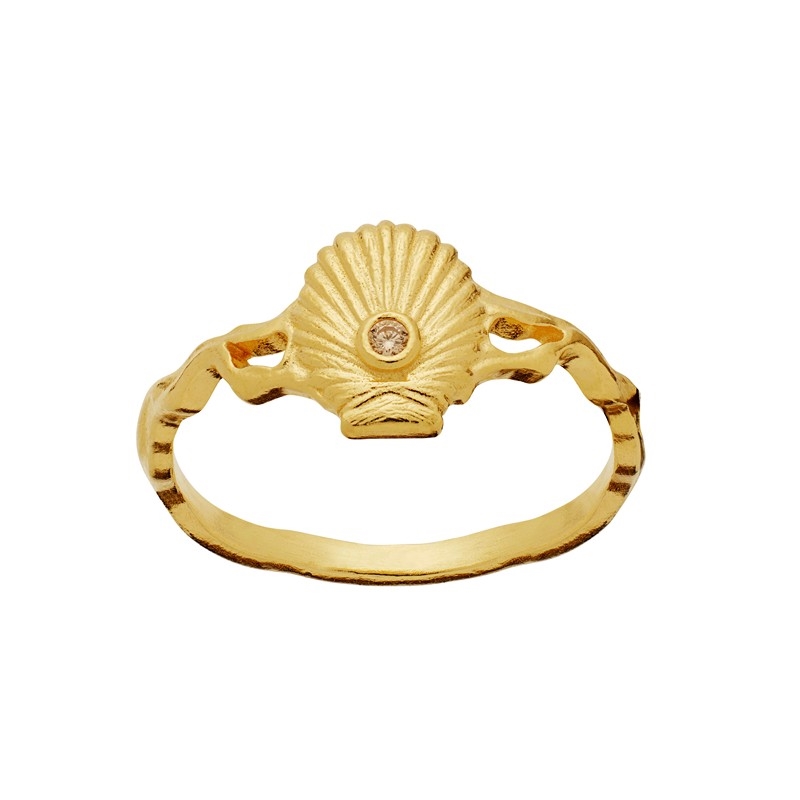Myra ringen fra Maanesten er en smuk og feminin ring i forgyldt sølv, designet med en champagnefarvet zirkonia i midten. Den varme stenfarve giver et blødt skær og et elegant spil, som fremhæver ringens organiske udtryk. På siden af ringen finder du en lille stiliseret musling, som tilfører en fin og symbolsk detalje. Muslingen er et motiv, der forbindes med havet og indre styrke, og her bidrager den til ringens poetiske og feminine energi.Ringen er en del af Maanestens Aphrodite-kollektion til forår og sommer 2025. Kollektionen hylder Afrodite, gudinden for kærlighed og skønhed, og hvert design bærer en påmindelse om at omfavne sin indre gudinde. De bløde former, de naturlige detaljer og den varme farvepalette afspejler denne fortælling. Myra ringen er derfor ikke kun et smykke, men også et lille symbol på selvkærlighed, intuition og personlig styrke.Ringen kan bæres alene som et enkelt statement, men den fungerer også smukt sammen med andre ringe, hvis du ønsker et mere legende og lagdelt look. Den champagnefarvede zirkonia harmonerer nemt med både andre gyldne nuancer og smykker med farvede sten. Myra ringen er et perfekt valg til dig, der elsker smykker med personlighed og blød elegance, og som ønsker et design medbåde historie og hjerte.