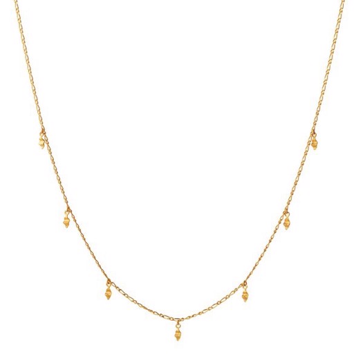 Una halskæden fra Maanesten er et klassisk smykke, der er blevet et vaskeægte must-have i smykkeskrinet. Halskæden er udført i forgyldt sterlingsølv og prydes af syv små, blankpolerede stykker forgyldt sølv på forsiden af kæden. De små vedhæng tilfører et diskret spil, der fanger lyset og giver halskæden et levende og elegant udtryk.Det enkle design gør Una til en alsidig halskæde, som er smuk alene, men samtidig oplagt at kombinere med andre kæder for et mere personligt og lag-på-lag inspireret look. Netop den fleksibilitet er en af grundene til, at Una igen og igen finder vej ind iMaanestens kollektioner og fortsat er en favorit blandt mange.Maanesten, designet af Lotte Venø Callesen, er kendt for at skabe smykker, der rammer tidens ånd med inspiration fra blomster, havet og naturens organiske strukturer og mønstre. Kollektionerne består altid af et bredt udvalg af ringe, armbånd, øreringe og halskæder i både sølv og forgyldt sølv, ofte med smukke sten og perler i forskellige farver.Med Una halskæden får du et tidløst og feminint smykke, der kan bruges hver dag – og styles til enhver anledning.