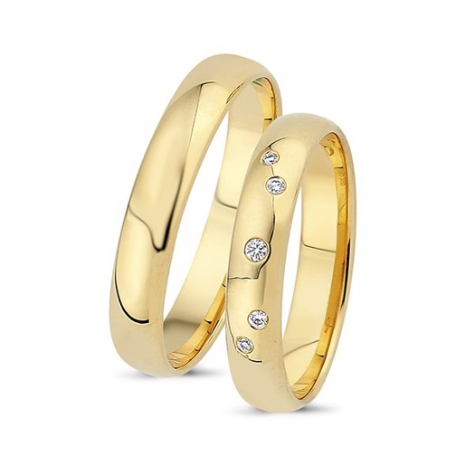 Vielsesringe i 14 kt guld med 5 brillanter på i alt 0,05ct. på dameringen. Begge ringe har den samme smukke let buede profil, der gør dem meget behagelige at bruge i hverdagen. Vielsesringe i guld til den store dag og resten af livet, skal være ringe der passer, er behagelige at have på. Der ud over er det dejligt at ringene er til enpris, der ikke skabet bekymringer senere. Med Vielsesringene fra Nuran, får i her et sæt vielsesringe i 14 karat guld med diamanter på i alt 0,05ct. Dameringen og herre ringen har den samme profil og blanke overflade, der gør ringene gode at bruge i hverdagen.Nuran er kendt for at lave eksklusive vielsesringe i en høj kvalitet, af guldsmede der skaber ringene efter gamle håndværkstraditioner og med rigelige mængder kærlighed til faget. Det giver jer et par vielsesringe i godt design, utrolig kvalitet og i materialer og diamanter I kan glæde jer over i årene frem.Vielsesringe fraNuran leveres i en lækker smykkeæske der vil opbevare jeres ringe trygt til bryllupsdagen.