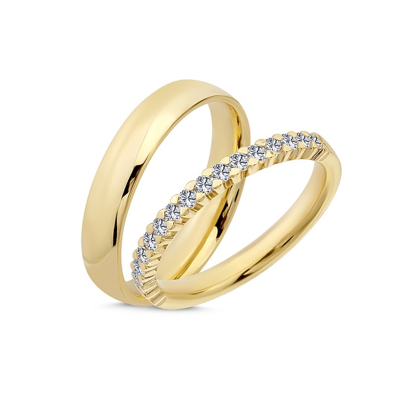 Klassiske vielsesringe i 14 karat guld. I dette sæt vielsesringe er dameringen designet som en klassisk alliancering med brillanter i et bånd på langs af ringskinnen. Herre ringen er lavet i et matchende bånd af guld dog uden brillanter. De smukke sten på dameringen er brillantslebne diamanter på i alt 0,28 ct. i kvaliteten wesselton/siDeelegante vielsesringe fra guldsmeden Nuran er noget helt specielt. Når jeres ringe kommer fra NURAN, kan I være sikre på at ringene er lavet i godt design og i en utrolig høj kvalitet. Her er ikke sparet på noget. Ringene er lavet på Nurans egne værksteder og specielfremstilles til jer og jeres behov. Med en stor ærbødighed og stolthed til guldsmedefaget, sættes der en ære i at levere jeres vielsesringe, der er smedet med en stor del kærlighed.Vielsesringene til en af de største dage i jeres liv sammen, er altid en stor og vigtig beslutning. Med vielsesringe fortæller man en fælles historie og der er mange overvejelser når I skal beslutte jer for jeres ringe.