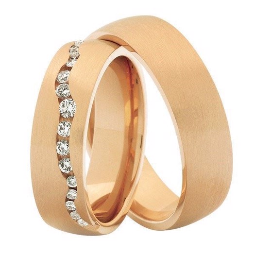 Disse smukke vielsesringe fra Nuran i 14 karat rosaguld kombinerer klassisk elegance med moderne detaljer. Dameringen er prydet med 16 brillanter i forskellige størrelser – 1×0,03 ct, 4×0,02 ct, 1×0,015 ct og 10×0,01 ct – sat i en kanalfatning, som fremhæver stenens glans og giver et harmonisk udtryk.Herreringen er holdt helt enkel med en silkemat overflade, der skaber en smuk kontrast til den funklende damering. De to ringe danner tilsammen et balanceret og tidløst sæt, der passer perfekt til enhver stil.Rosaguldets varme farvetone tilfører en romantisk glød og er et populært valg for par, der ønsker et blødt og eksklusivt udtryk. Den matte finish giver et diskret spil i lyset, og ringene føles behagelige mod huden i daglig brug.Som alle Nuran vielsesringe er dette sæt håndlavet på eget værksted i Danmark. Hvert par fremstilles med stor præcision og kærlighed til guldsmedehåndværket – et symbol på varig kvalitet og ægte kærlighed.