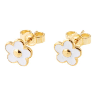 Ørestikker i forgyldt Sølv med Blomster fra Lund Copenhagen.Fine og smukke ørestikker i forgyldt Sølv med hvide Blomster. Blomsterenes diameter er 7,0 mm.Overfladen er poleret og emaljeret.Se matchende vedhæng og ring.Ørestikkerme kan fint kombineres