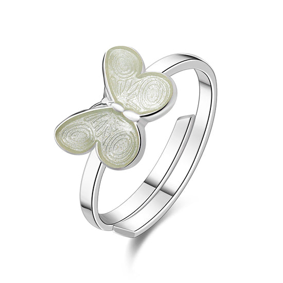 Sød børnering med en sommerfugl som er belagt med hvid ægte emalje. Børneringen er lavet i sølv. Ringen er str 45 men kan udvides op til str 50.