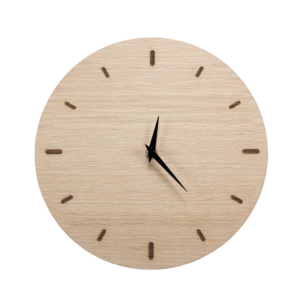 Hyggeligt og stilrent rundt vægur skåret i træ.