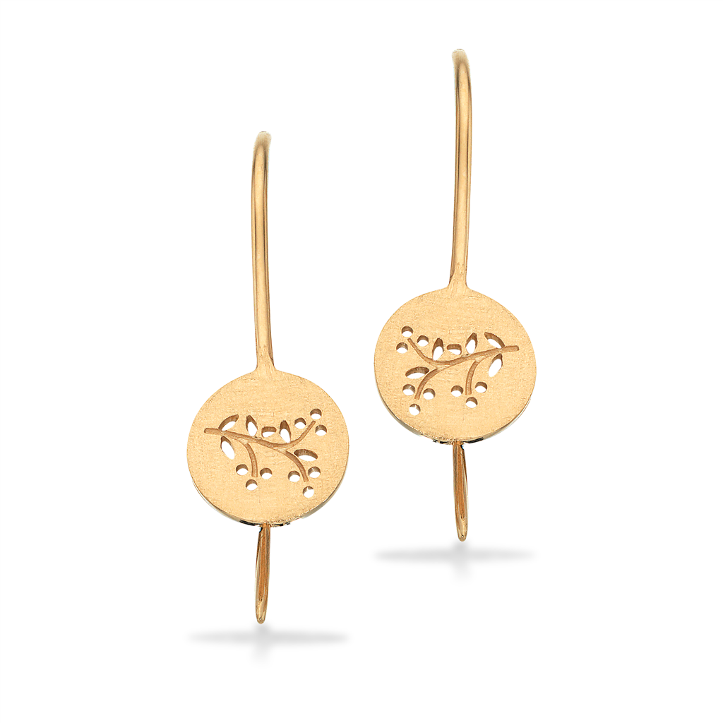 Prima Vera ørebøjler fra Scrouples i 14 karat guld. Ørebøjlerne er med gren motiv. Selve pladen på ørebøjlen måler 8mm.