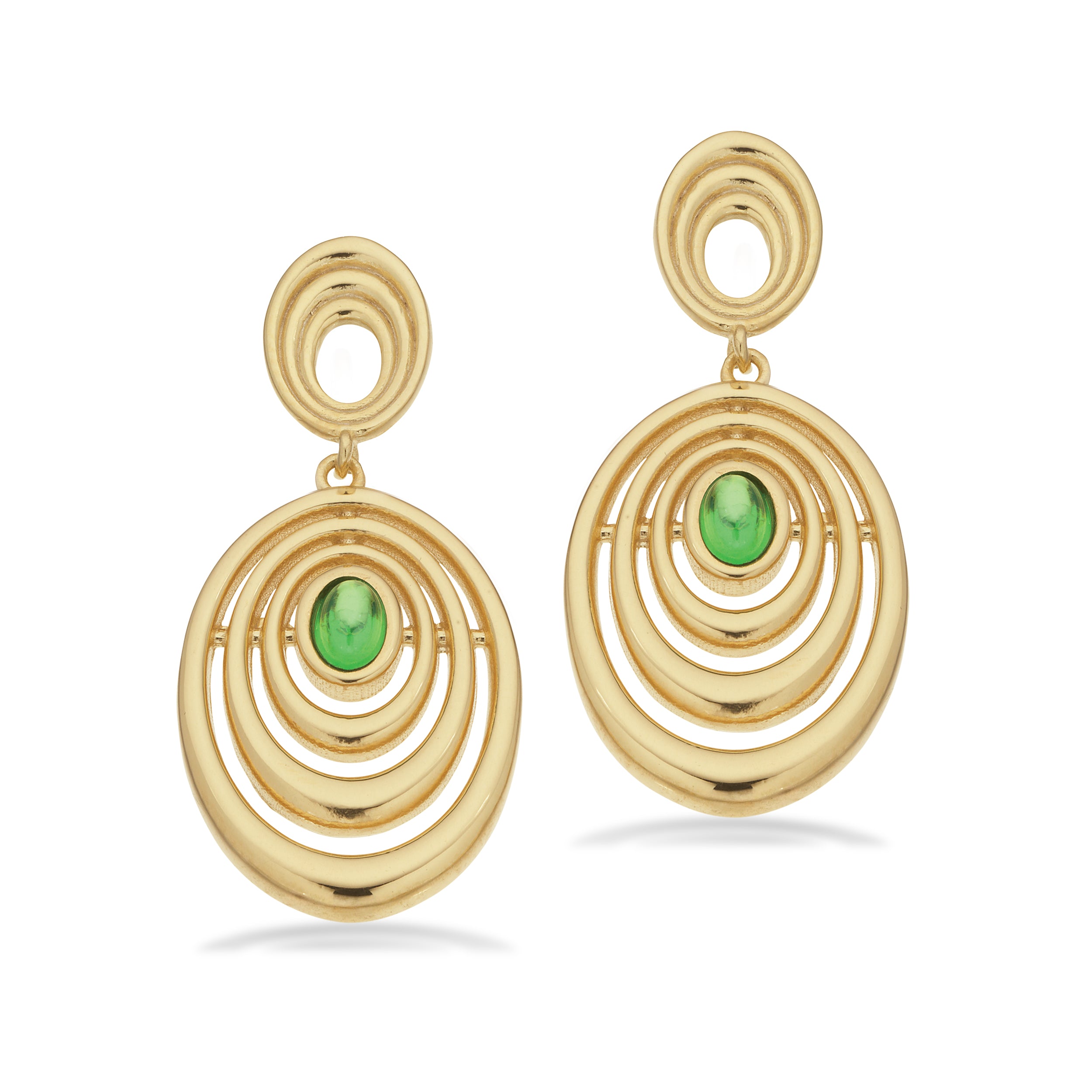 Disse forgyldte sølv ørehængere fra Scrouples kombinerer moderne design med tidløs elegance. Ørehængerne er sammensat af ovale ringe, med en smuk grøn sten i midten af vedhænget, hvi