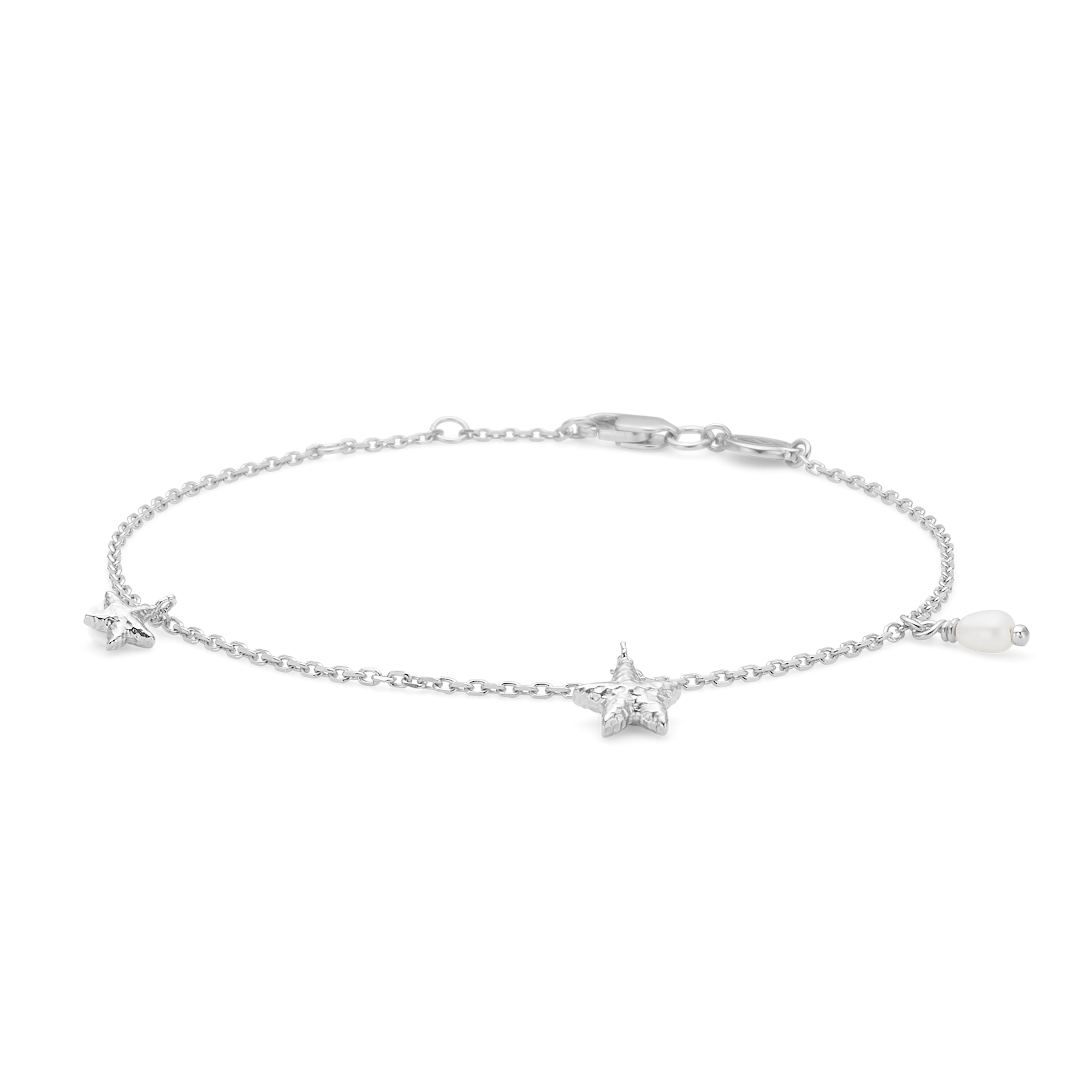 Smukt og elegant sølvarmbånd fra Studio Z, inspireret af havets skønhed. Armbåndet har to fine søstjernevedhæng i forskellige størrelser samt en lille, hvid ferskvandsperle, der tilfører et n