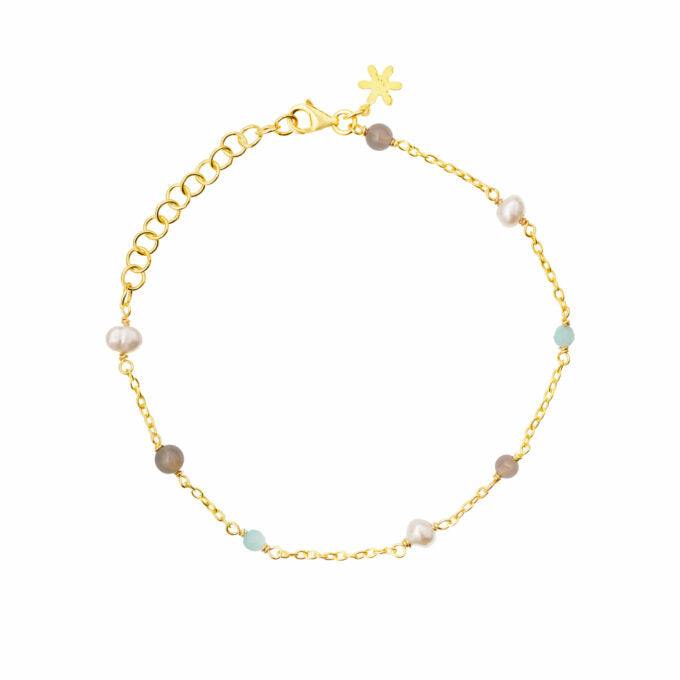 Forkæl dit håndled med det forgyldte sølv armbånd fra Susanne Friis Bjørner, smukt sammensat med en palet af ædelstene og perler. Dette elegante armbånd kombinerer en lys grøn amazonit, grå månesten og fine hvide ferskvandsperler, der skaber et subtilt og