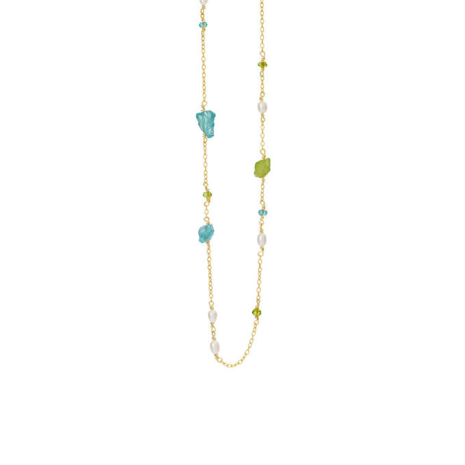 Dette smukke anker halskæde fra Susanne Friis Bjørner kombinerer forgyldt sølv med en vidunderlig sammensætning af ægte sten og ferskvandsperler. Halskæden prydes med e