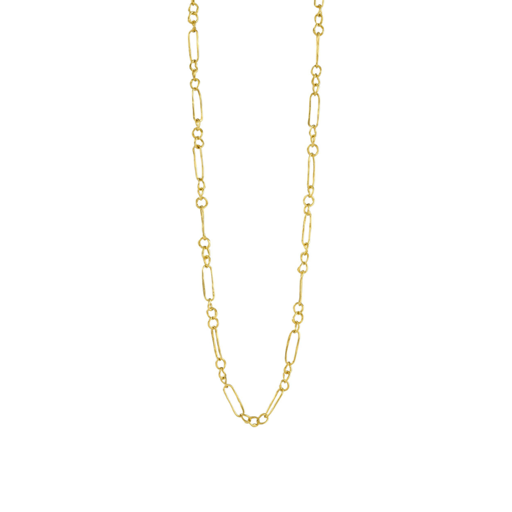 Denne smukke halskæde fra Susanne Friis Bjørner er udført i forgyldt sølv og er designet som det klassiske Figaro møster. Halskæden består af en harmonisk kombination af ovale og runde led, som alle har en hamret og mat finish. Dette skaber et rustikt, me