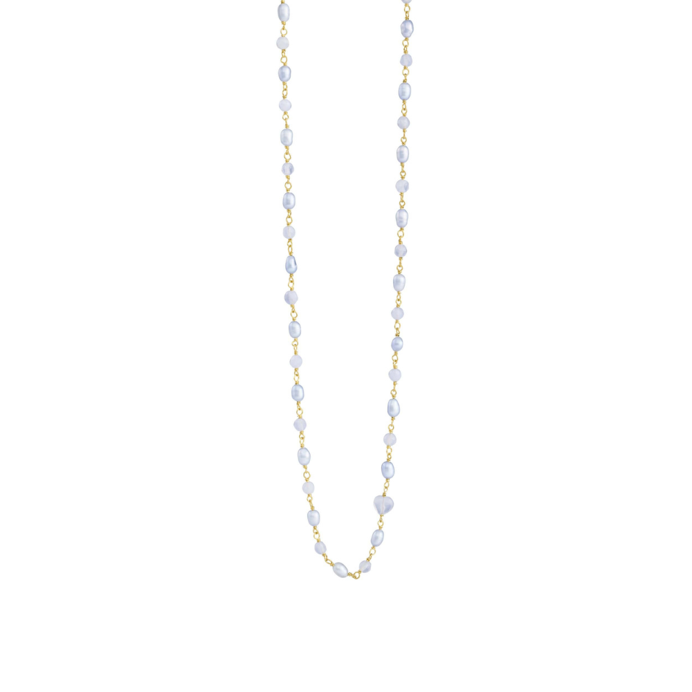 Denne smukke halskæde fra Susanne Friis Bjørner er lavet i forgyldt sølv og udsmykket med flotte lyseblå ferskvandsperler samt blå calcedon sten. Størstedelen af calcedon stenene er facetslebne, mens en enkelt større sten er glat og tilfører en unik dimen