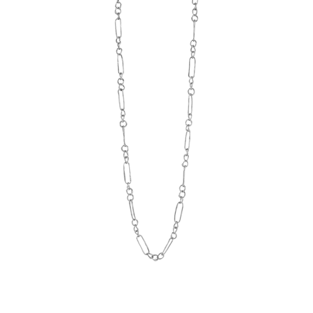 Denne elegante halskæde fra Susanne Friis Bjørner er fremstillet i sterling sølv og er designet med det klassiske Figaro-mønster. Halskæden består af en smuk kombination af ovale og runde led, alle med en hamret og mat finish, som giver et rustikt, men sa