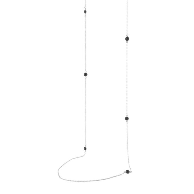 Sølv halskæde med runde cabochon slebet sorte agater. Halskæden er 95 cm lang hvilket gør at man kan køre den dobbelt rundt om halsen. Man kan også bruge den som en lang halskæde.