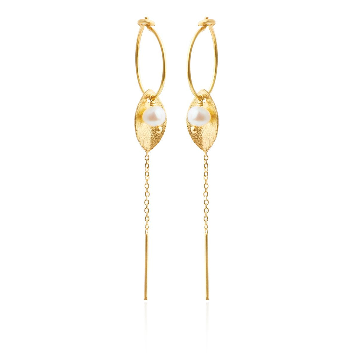 Pift dit look op med disse smukke creoler fra Susanne Friis Bjørner. Creolerne er lavet i forgyldt sølv og prydes af et dekorativt blad, der bærer en skinnende ferskvandsperle. En f